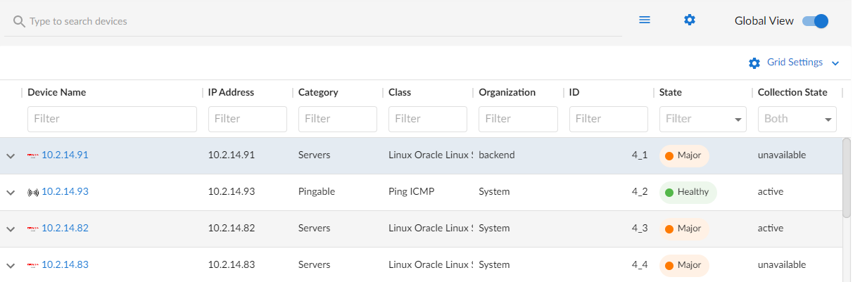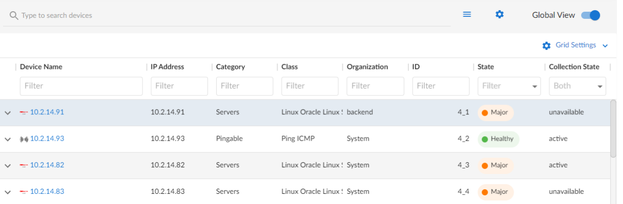 • When the Global View button on the Devices page is toggled off, you can view a list of devices discovered only on the Global Manager system itself.