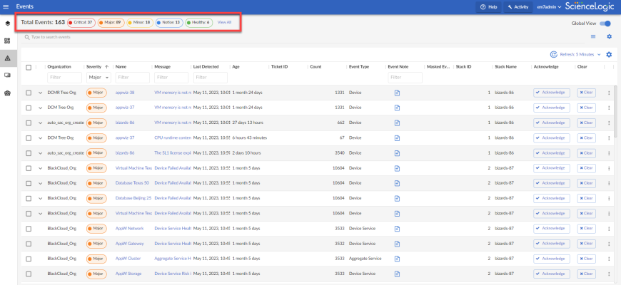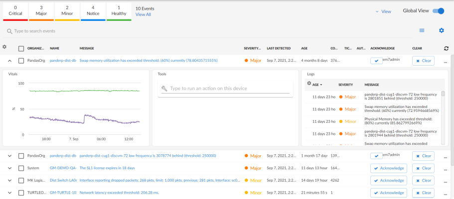 The Events page displays a list of active events, from critical to healthy. From this page you can acknowledge, clear, and view more information about an event. You can also view events by organization to focus only on the events that are relevant to you.