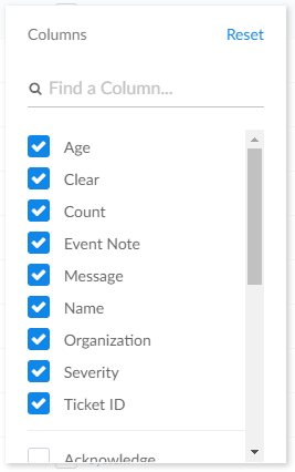 If you want to hide the Acknowledge or Clear buttons on the Events page, click the Select Columns icon (Image of the Choose Columns icon) and deselect those columns.