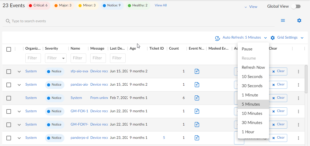To refresh the Events page manually, click the Auto Refresh icon and select Refresh Now.