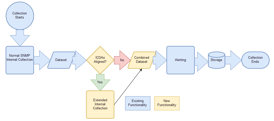When Skylar One begins an internal collection, it checks to see if any ICDAs are aligned. If ICDAs are aligned, Skylar One performs an "Extended Internal Collection". The platform combines data it collected using ICDAs with data it collected using an internal SNMP process, and then the platform completes the collection process.