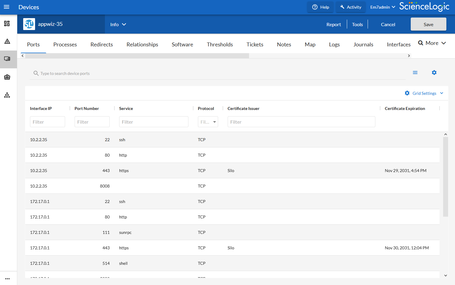 Every night, Skylar One scans all the ports of each managed device. If any new ports are opened, Skylar One adds the port to the list on the tab.