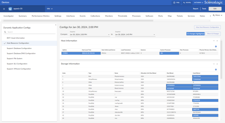 On the tab of the Device Investigator, you can view configuration information that has been collected from the device by Dynamic Applications. You can also view a list of all changes that occurred with a Dynamic Application between two specific snapshot reference points.