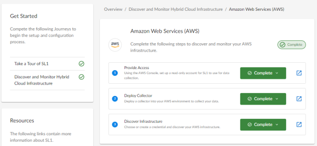 1. After you have completed the activities, you can return to the workflow pictured below and mark your progress as Complete. The workflow status updates in both the Discover and Monitor Hybrid Cloud Infrastructure journey card and the Get Started information card.