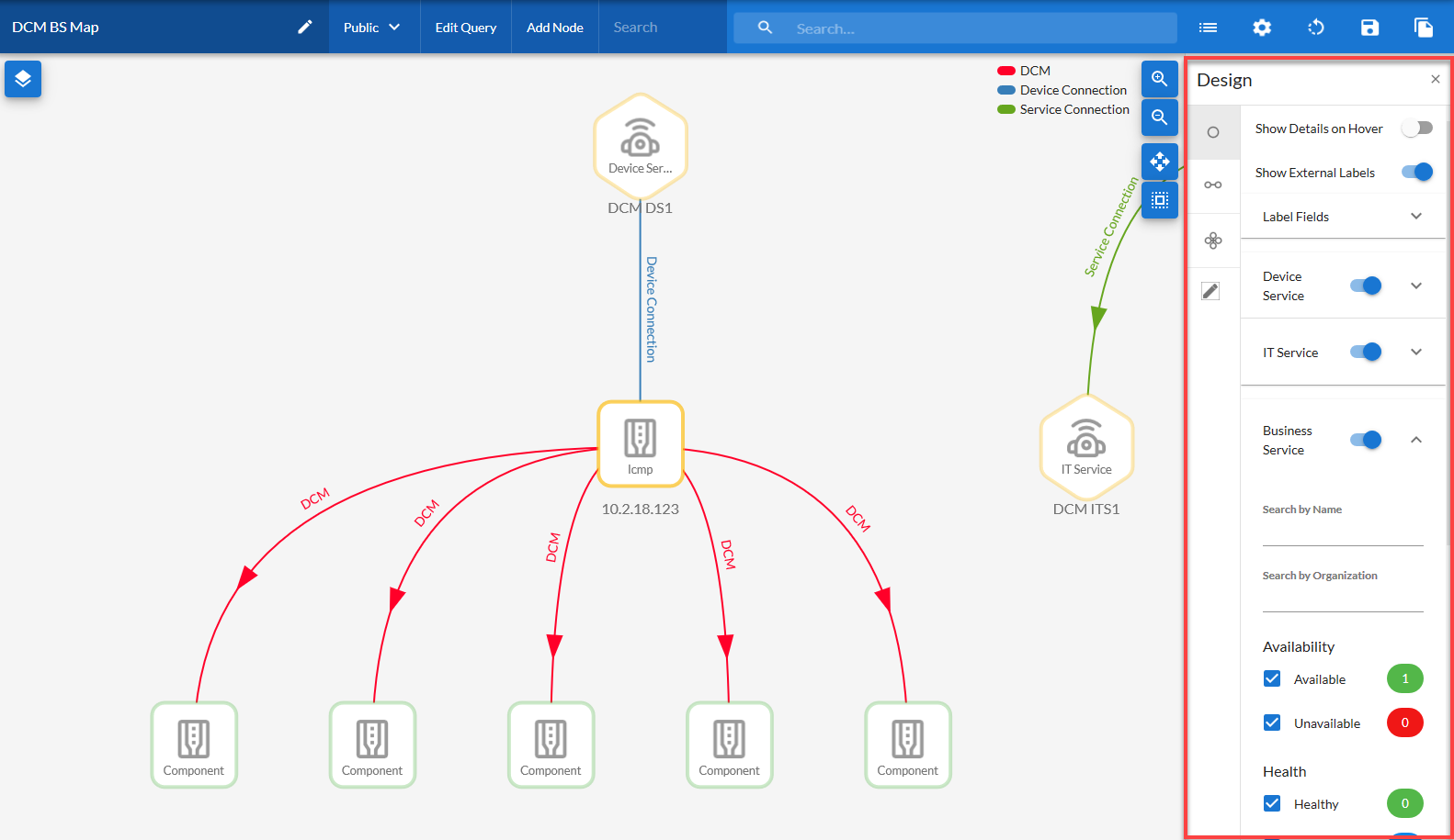• Type. Colors the links based on the type of relationship, such as DCM (Dynamic Component Map) or Service Connection, represented by the link.