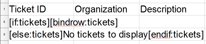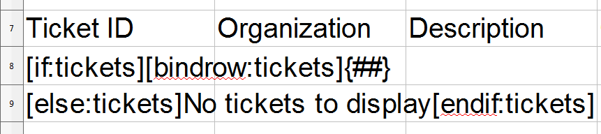 - Add a [bindrow:] directive. When the [bindrow:] directive is used with an array, the report engine will duplicate the row the [bindrow:] appears on for each item in the array. In our example, the displayed table will contain a row for each ticket in the array tickets. Enter "[bindrow:tickets]" after "[if:tickets]" in cell A8: