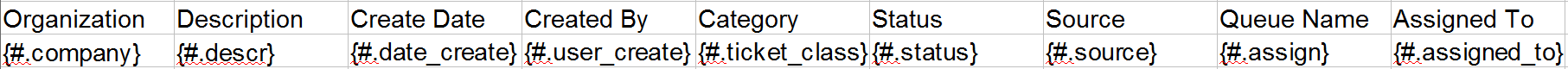 - Add variable substitutions. Variables are inserted into Report Output Templates using curly braces. As described in the gluecode section, suppose the gluecode returns a ticket with ticket id 0. The ticket data will be stored in the following array structure: