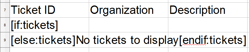 - Add [if:], [else:] and [endif:] directives. These directives are conditional statements that are used to evaluate inputs and then specify one of multiple outputs (based on the inputs). In this example, we will use them to check if the gluecode has passed any tickets as output. If the gluecode has passed tickets, the report will display a table with the ticket information. If the gluecode has not passed any tickets, , the report will display the message "No tickets to display". These directives use the value of the boolean tickets to determine if there are tickets to be listed. Enter "[if:tickets]" in cell A8, and "[else:tickets][endif:tickets]" in cell A9: