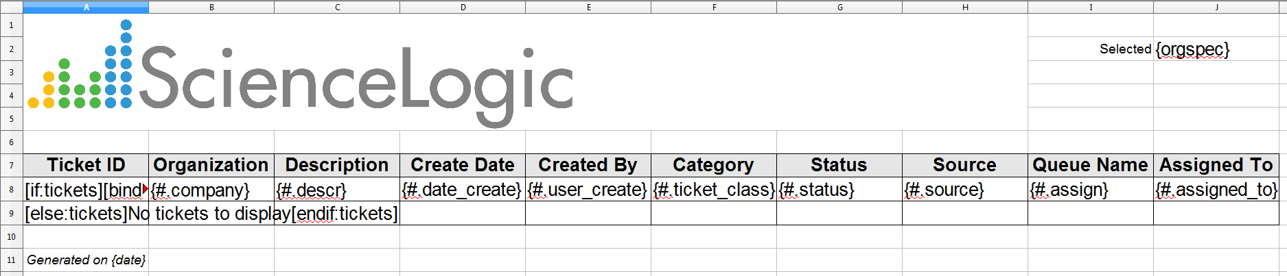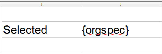 - Add header information to display the options used to generate the report. The default reports created by ScienceLogic use the upper right-hand two columns to display the options used to generate the report. In our example, the variable orgspec is passed by the gluecode. orgspec specifies whether the user selected the All Organizations checkbox in the Report Input Form. If the user selected the All Organizations checkbox, orgspec is set to "All Orgs". If the user did not select the All Organizations checkbox, orgspec is set to "Selected Orgs". orgspec can be substituted into the report in the same way date was in the previous step. Enter "Selected" in cell I2 (eye-two), and "{orgspec}" in cell J2:
