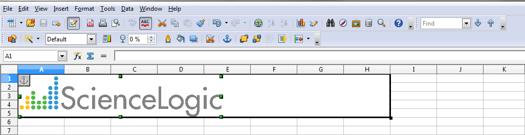 - Insert a header image. Merge cells A1 - H5, then insert an image and anchor the image to the merged cell. In this example the ScienceLogic logo image is used: