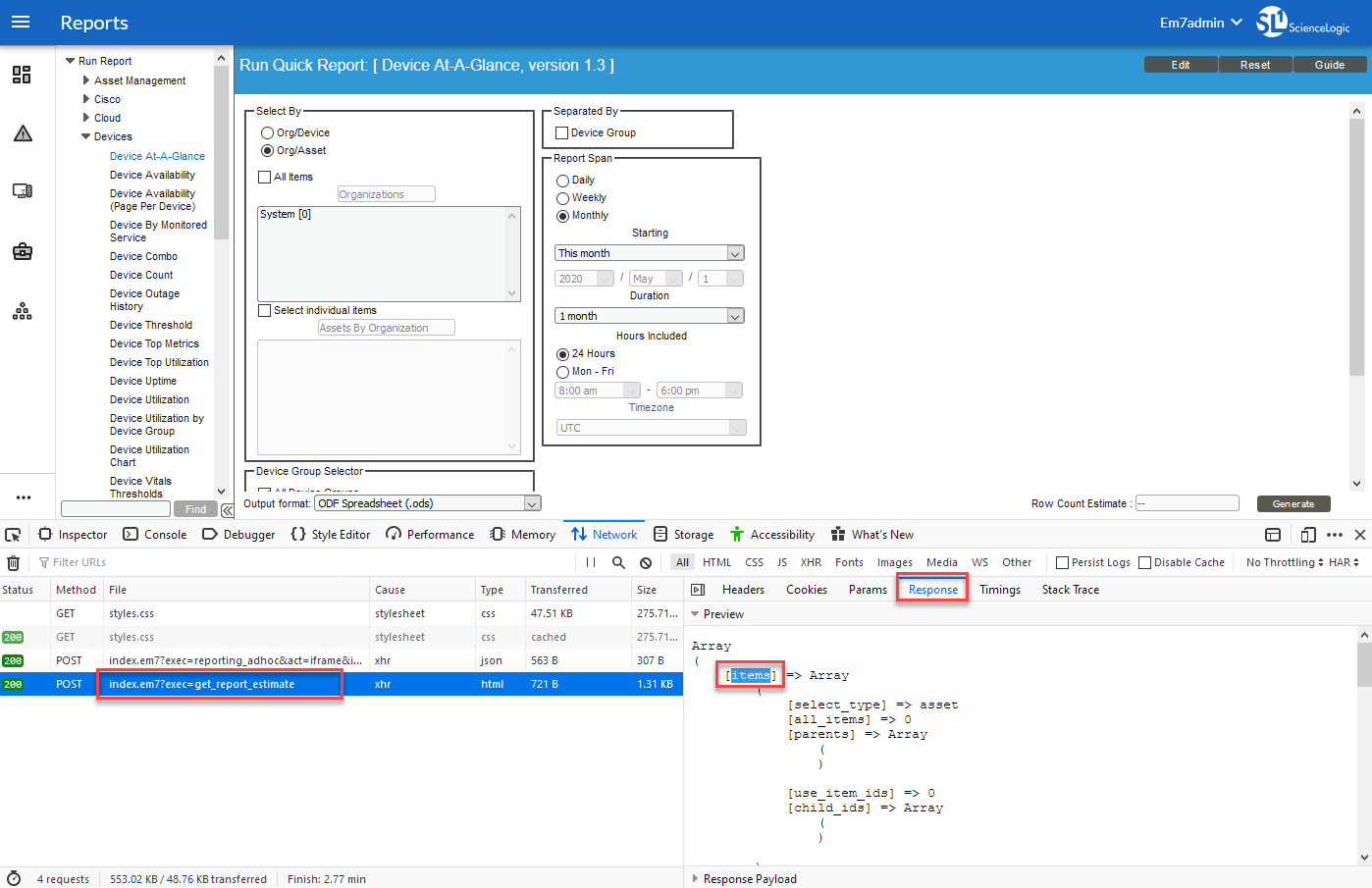 In the File column of the Web Developer console panel, select index.em7?exec=get_report_estimate. This is the name of the AJAX call used by Skylar One.