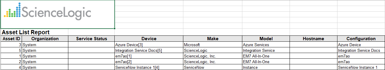 The report displays the following information from each asset record: