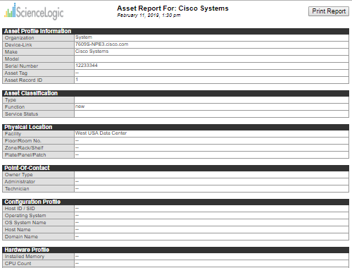 - Partial. Displays all of the information in the Asset Properties page and some information from the Asset Maintenance & Service page and the Asset Configuration page.