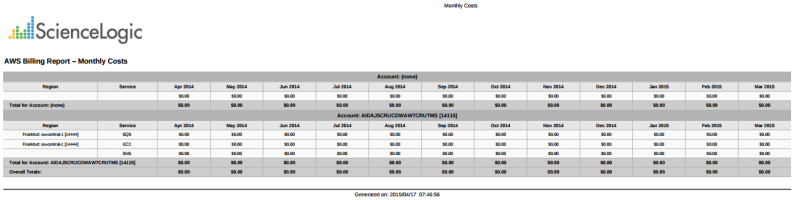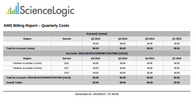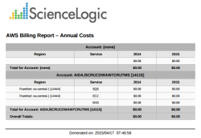 This report displays service costs for Amazon Web Services. The report includes Total, Monthly, Quarterly, and Annual costs.