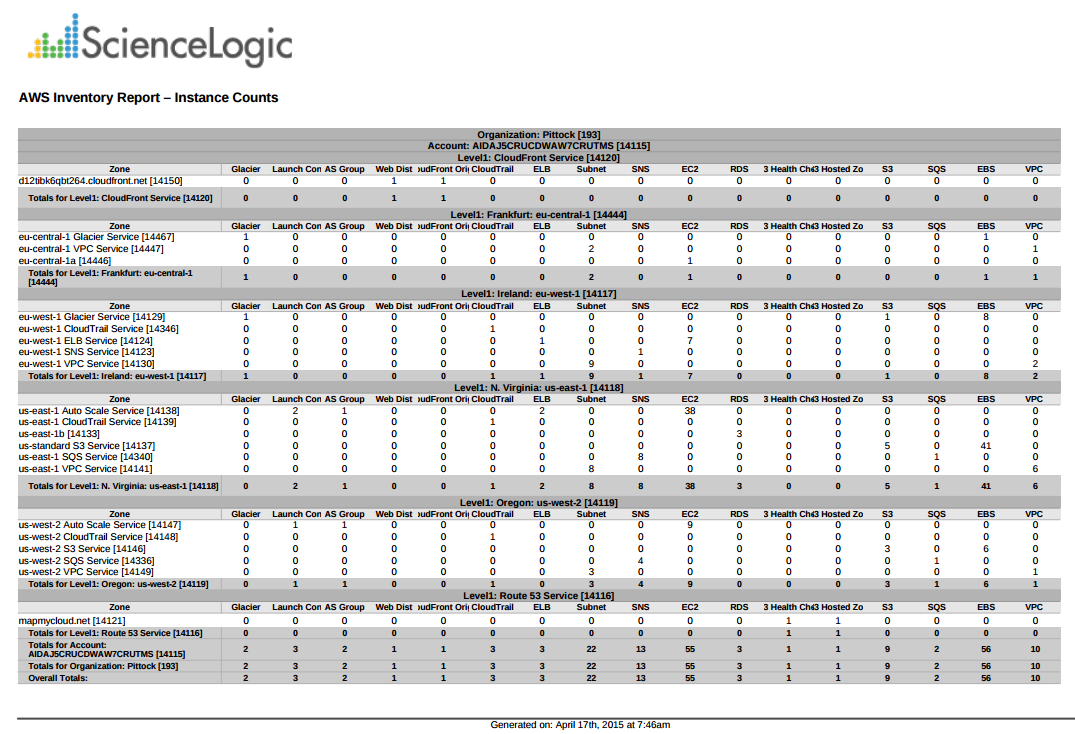 This report displays an inventory of AWS instance counts. The report includes the number of each kind of instance in every zone associated with the chosen accounts. It also includes a count of each EC2 instance size in each zone.