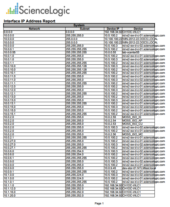 This report displays configuration information for selected IP addresses. For each IP address, this report displays default columns of Network, Subnet, Device IP, and Device.