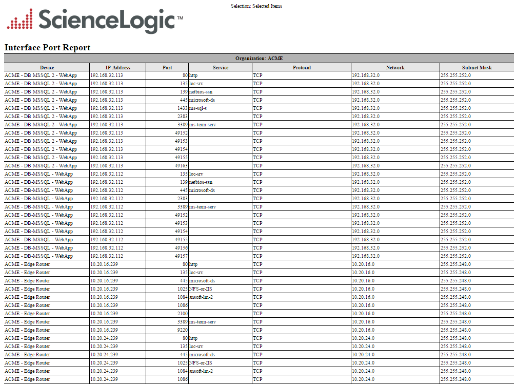 This report displays a list of open ports on all selected devices or all selected networks. For each open port, the report displays default columns of Device, Device Groups, IP Address, Port, Service, Protocol, Network, and Subnet Mask.