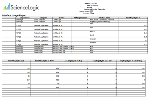 This report displays information about interface usage for each selected device, asset, or VM, including total and average usage.