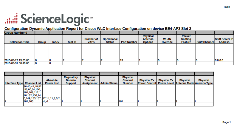 This report displays configuration data collected from a device using a Dynamic Application. For each table of data defined in the Dynamic Application, the report displays columns for collection time, group, and index, plus a column for each collection object.