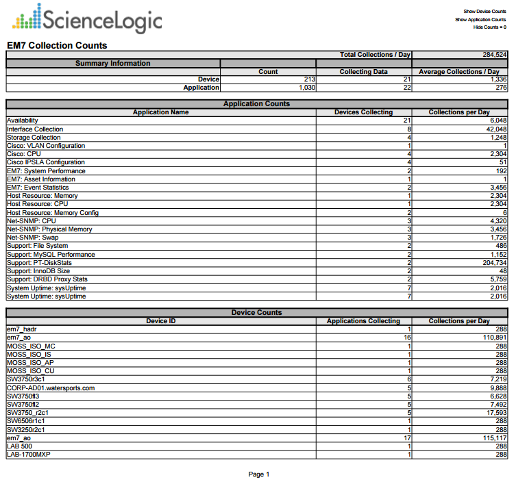- A table that displays a list of all devices for which Skylar One is performing collection. For each device, the report displays the number of monitoring elements aligned with the device and the average number of data points being collected per day for each device. This table is optional.