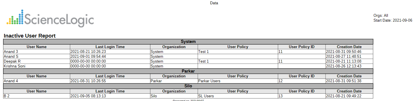 The report displays users who have logged in during the specific timespan and the timestamp of their last login. You can also choose to list the users' organization, user policy, user policy ID, and user creation date.