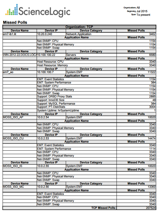 - Show Only Apps with Missed Polls. If you do not select this checkbox, the list of Dynamic Applications aligned with each device will include all Dynamic Applications. If you select this checkbox, the list of Dynamic Applications aligned with each device will include only Dynamic Applications that have a number of missed polls greater than one. This option has no effect if you do not select the Show Missed Polls by Application checkbox.