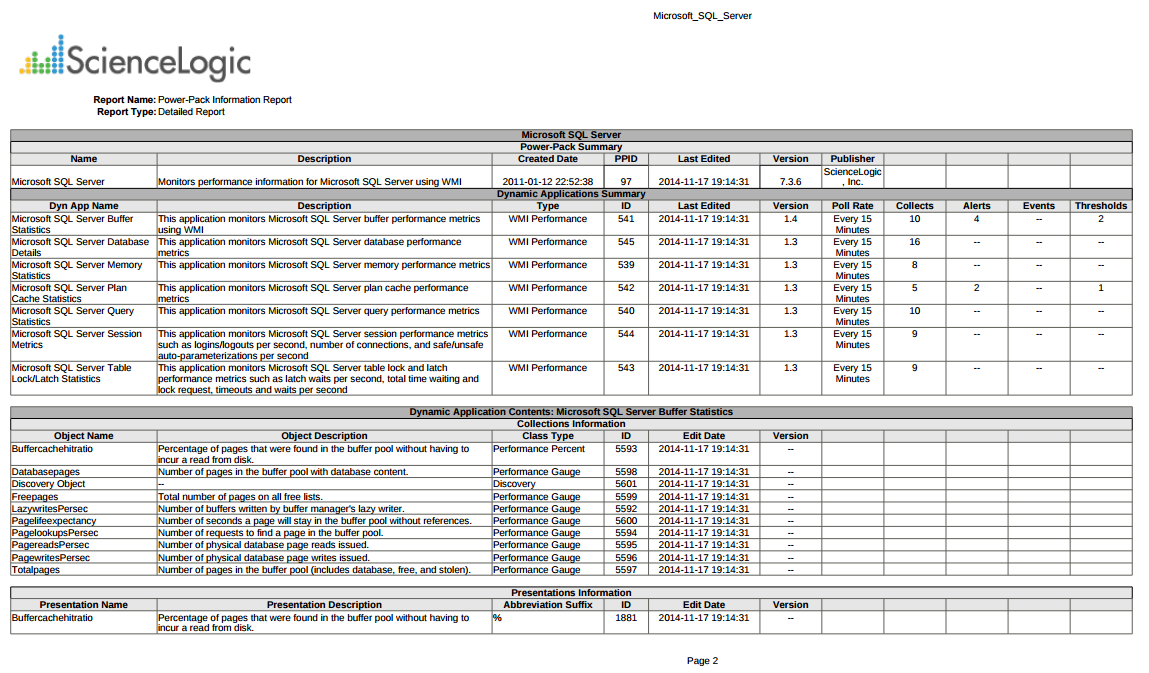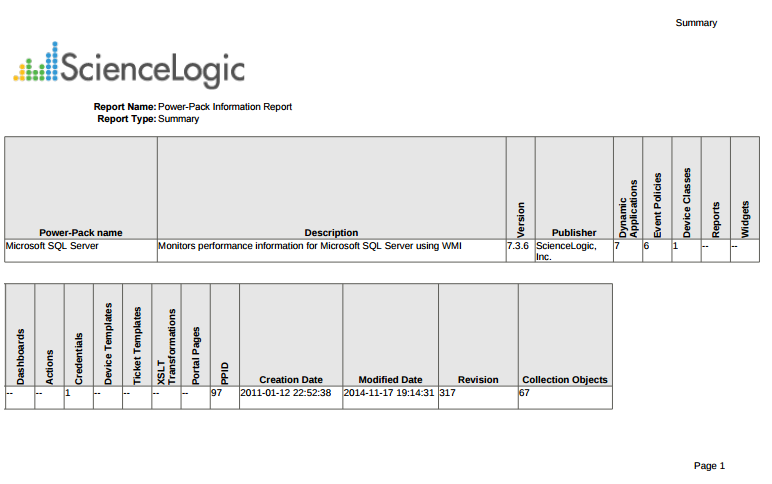 - Dynamic Apps Summary. This section lists all of the Dynamic Applications included in the PowerPack and a summary that includes the Description, Type, ID, Last Edited date, Version number, Poll Rate, and the number of Collection Objects, Alerts, Events, and Thresholds for each Dynamic Application.