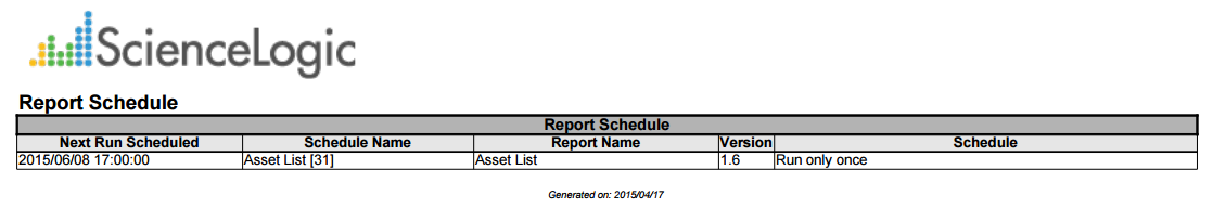 This report displays a list of scheduled reports from the Report Scheduler and details about each scheduled report. For each scheduled report, this Quick Report displays default columns of Next Run Scheduled, Schedule Name, Report Name, Version, and Schedule.