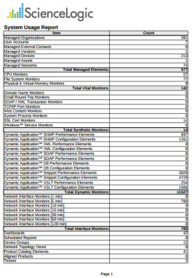 This report displays System Usage statistics for your Skylar One system. This report displays the number of Managed Elements, Vital Monitors, Synthetic Monitors, Dynamic Monitors, Interface Monitors, and Custom Elements. Displays a total of all modeling elements in a system. There are no input or output options for this report.
