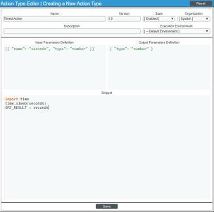 - Custom Action Type. A Custom Action Type executes a reusable snippet. Unlike the Action Type "Snippet", a Custom Action Type can accept input parameters (in a JSON format) and create output (in a JSON format). A Custom Action Type allows a single snippet to be used in multiple Action Policies, each time with different inputs and different outputs.