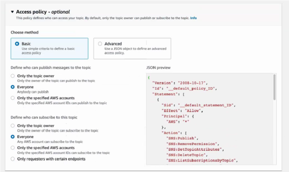 - Click Create Topic. Note the Topic ARN ID, as you will need this to set up the message and the action policy.