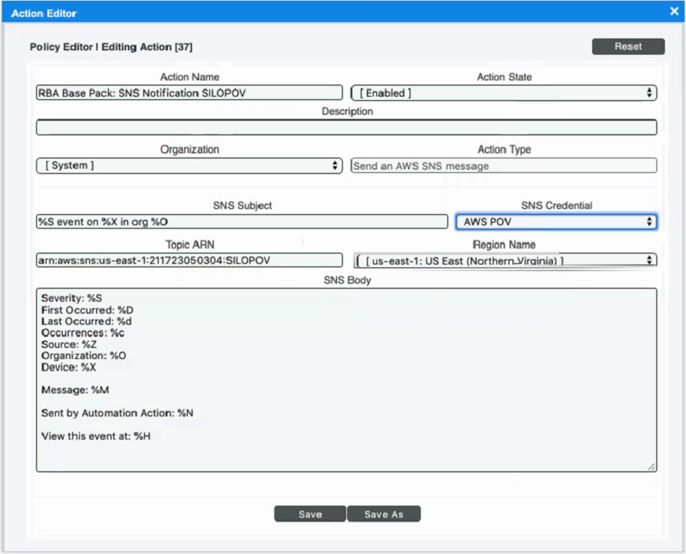 In the Action Policy Editor page, if you selected the Action Type of Send an AWS SNS message, you must supply values in the required fields, as specified in the section on Creating an Action Policy, and also supply values in the following AWS SNS fields: