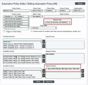 In the Automation Policy Editor, create an automation policy that runs the action policy you created for AWS SNS messages.