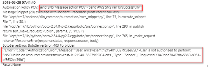 If the automation policy did not run successfully, you might see something like the following in the event. Troubleshoot as necessary.