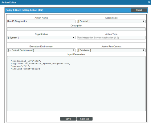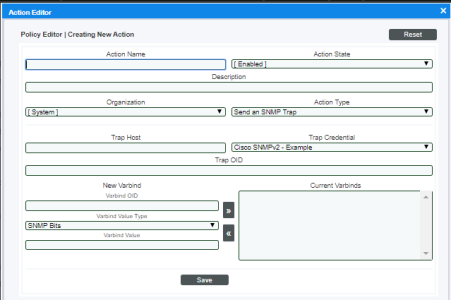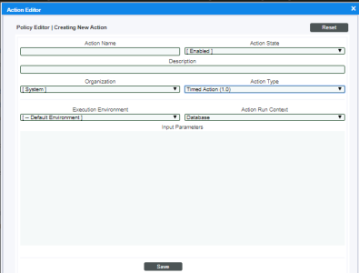 - . If you supply a new value in the Action Name field, saves the current action policy, including any edits, as a new policy with a new name.