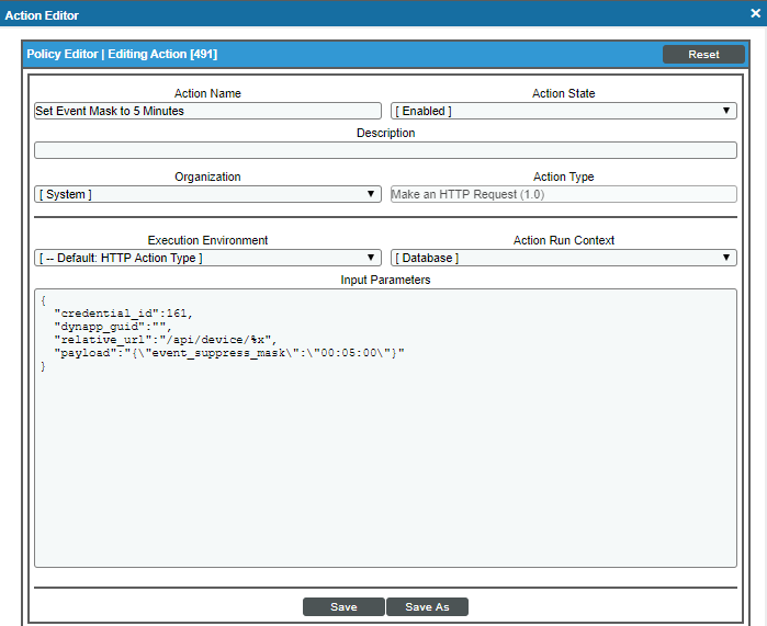 The following figure shows an example of a custom action that uses the "Make an HTTP Request" action type to set the Event Mask to 5 minutes: