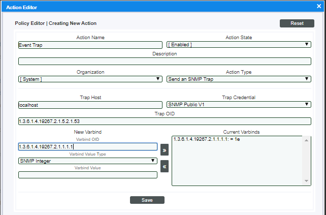 - To populate an OID contained in an SNMP Set command. The SNMP Set must be triggered by an action policy of type Send an SNMP Set.
