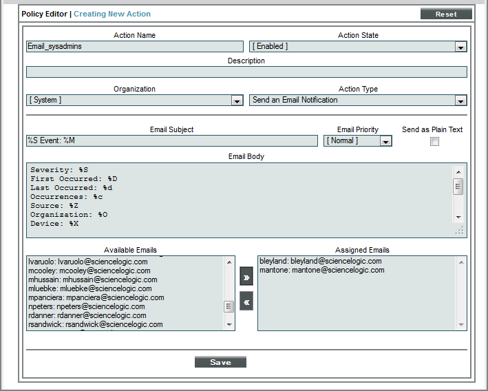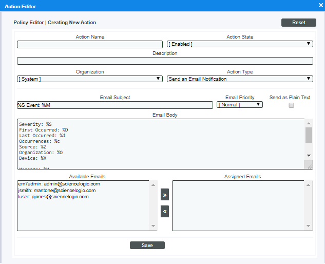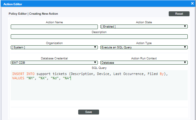 - In addition, the result of each action is available to the next executed action policy and can be accessed with the variable %_EM7_RESULT_%. You can define an action policy that uses the results of the previous action policy.