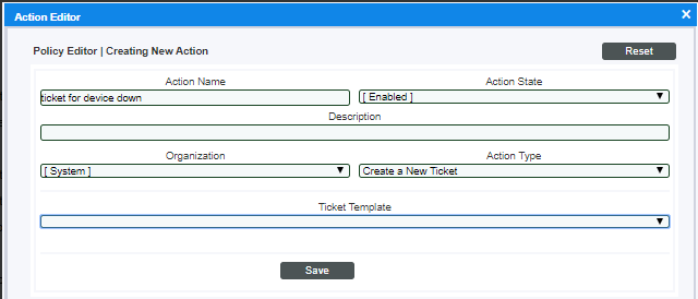 - Update an existing ticket. An action policy can change the status and/or severity of an existing ticket and/or add a note to an existing ticket. For this action policy to trigger successfully, a ticket must be associated with the event that triggered the action.