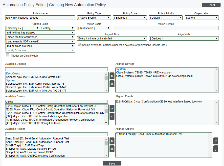 - You could define an automation policy that specifies the Cisco hardware to monitor and the event that is triggered when speeds are too slow.