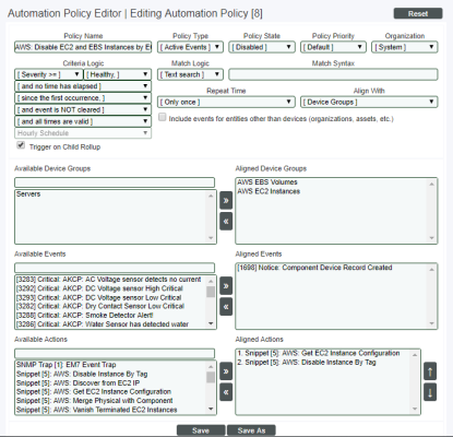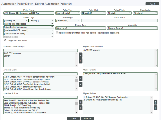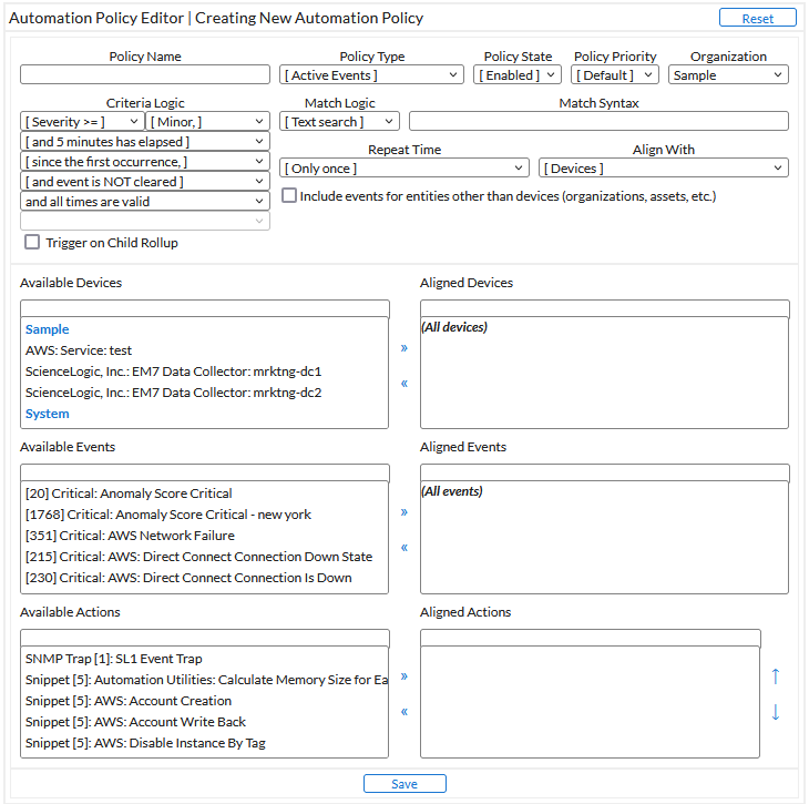- If you selected Devices in the Align With field, the Available Devices field is displayed in the Automation Policy Editor page.