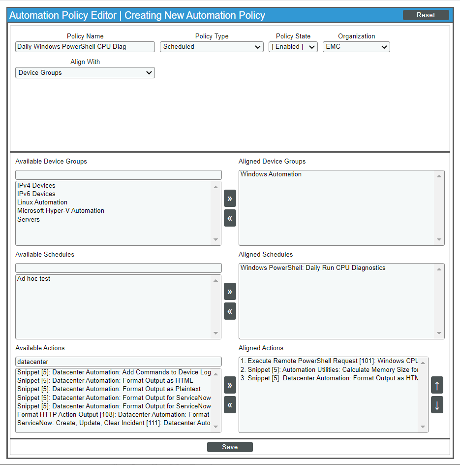In the example below, we have created an automation policy to run daily CPU diagnostics on our "Windows Automation" device group using the Windows PowerShell: Daily Run CPU Diagnostics schedule we created. We selected Aligned Actions based on the tasks we want to happen during the automation run.