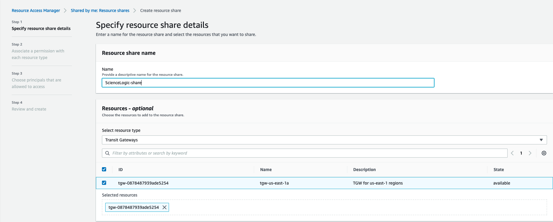 - In the Select resource type drop-down, select Transit Gateways. A list of available Transit Gateways will appear. Select the checkbox for the Transit Gateway you want to share with ScienceLogic.