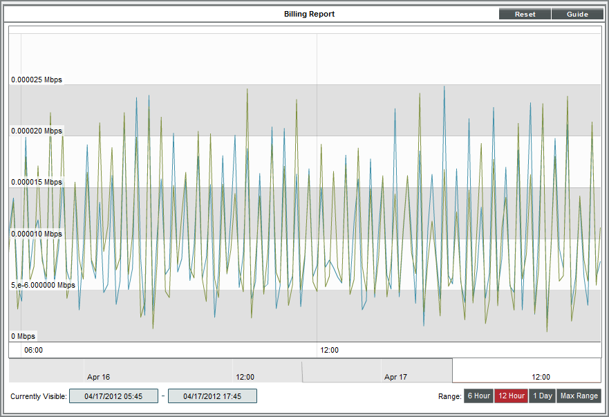 You can view the data associated with a virtual interface from the Bandwidth Billing Policies page. The report displays the Mbps in and Mbps out for the virtual interface. To view a report for a virtual interface associated with a bandwidth billing policy: