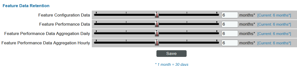 - Feature Performance Data Aggregation Daily. For users with a subscriber license. Number of months to retain the files and database tables that contain aggregated daily-performance values. Default value is six months.