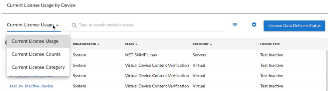 Current License Usage by Device. Choose "Current License Usage" from the drop-down list. Provides a list of all devices and the licenses they are using. You can search the table or filter on Device Name, Class, Organization, Category, or License Type.