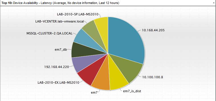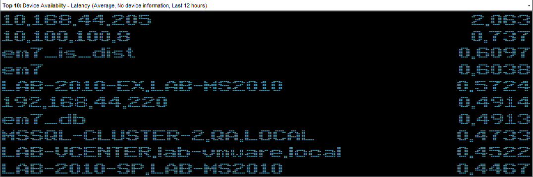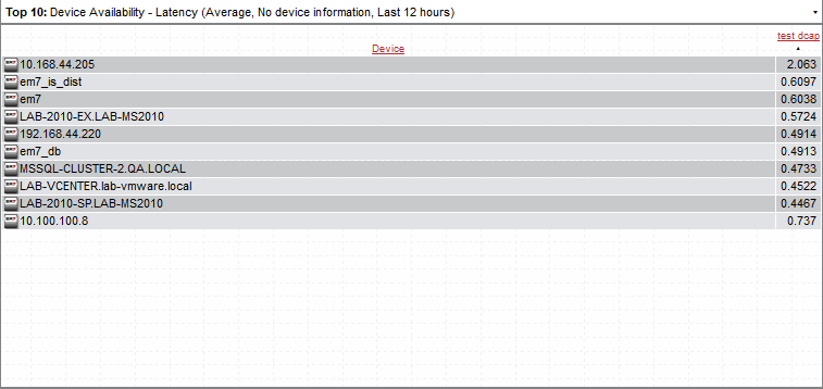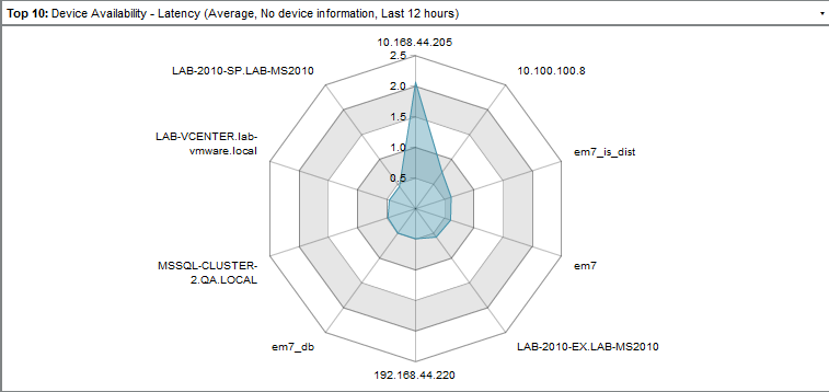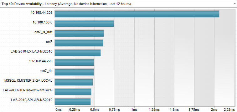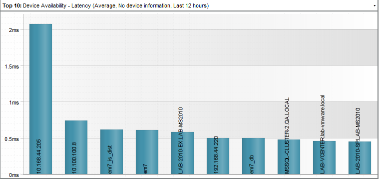 For example, an instance of the Leaderboard/Top-N widget that is configured to display the 10 devices with the highest average latency in a bar graph looks like this:
